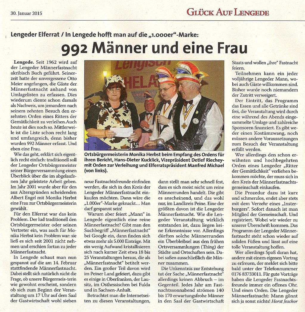 Die Peiner Nachrichten berichten am 16.02.15 über die Männerfastnacht